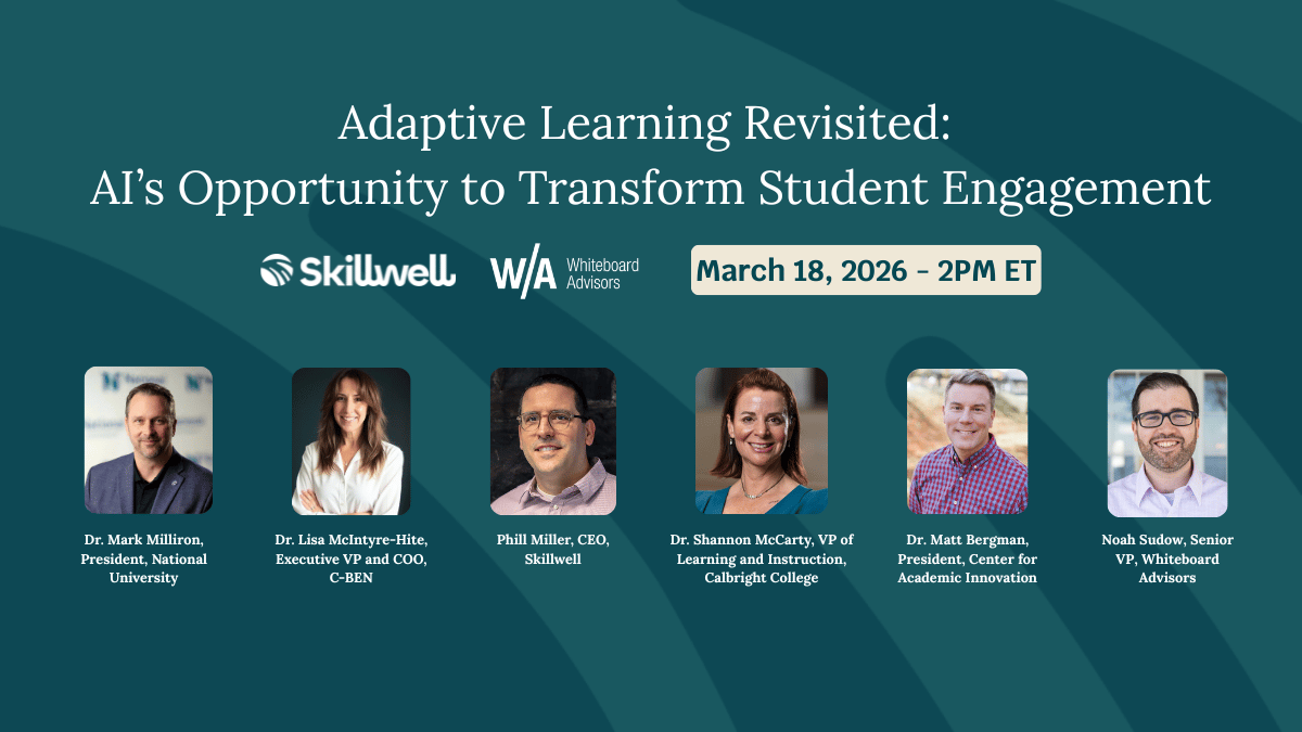 Join National University President & CEO Mark Milliron, Competency-Based Education Network Executive Vice President & COO Dr. Lisa McIntyre-Hite, Center for Academic Innovation President & Founder Dr. Matt Bergman, Calbright College Vice President of Learning and Instruction Dr. Shannon McCarty, and Skillwell CEO Phill Miller as they explore real use cases for AI-powered learning tools and simulations, insights from institutions already testing these approaches, and what guardrails are needed to ensure quality adoption and strong faculty leadership. Moderated by Whiteboard Advisors’ Senior Vice President Noah Sudow.